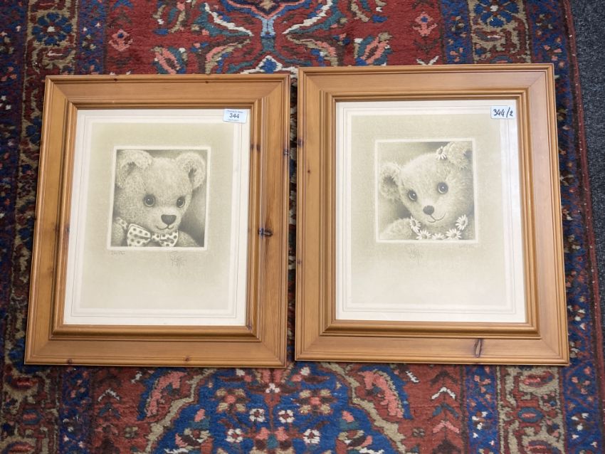 Sue Willis : Study of a Teddy Bear Wearing a Bow-Tie, sepia-style print, numbered 731/850, signed in pencil, 30 cm x 25 cm, together with the companion piece, both parts framed as a pair. (2)