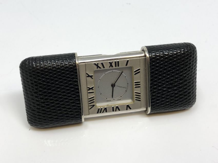 A Purse/Travel Alarm Watch by Tiffany & Co, quartz battery movement, silvered dial signed, centre alarm disc, in black faux leather sliding case, 57mm wide, with Tiffany & Co box, pouch and warranty/instruction booklet