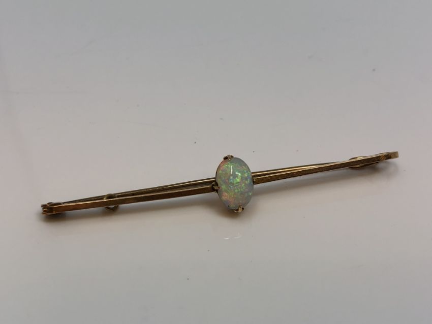 This requires some cleaning but looks in good condition. The stone is 5.32 mm x 7.4 mm, bar length 56 mm. Stamped 15ct.