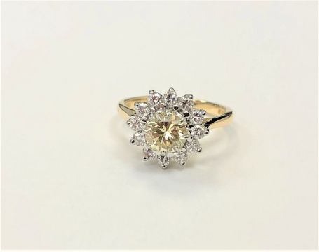 A fine quality 18ct gold diamond cluster ring, the principal fancy-yellow stone weighing approximately 0.90 carat, size N