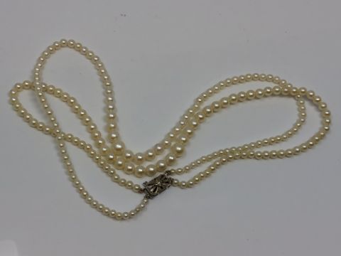 Pearks graduate from 7.67 mm to 3.16 mm, white gold 9ct clasp with marks a little rubbed. Diamond chip is very small in clasp but good condition. Length 42 cm.