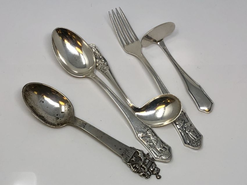 A highly ornate silver spoon and a four piece christening set depicting scenes from folklore signed, Art Krupp Binsdorf.
