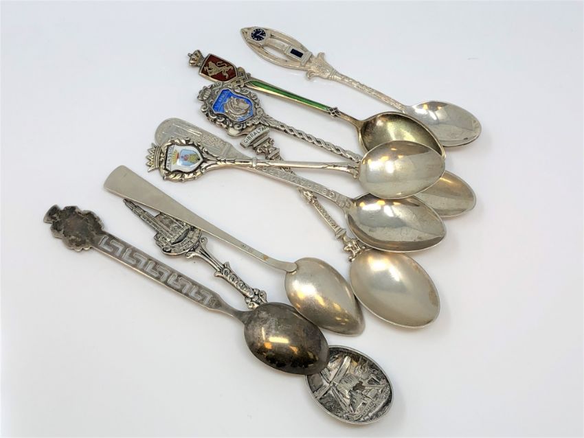 Nine assorted silver and enamel spoons. (9)