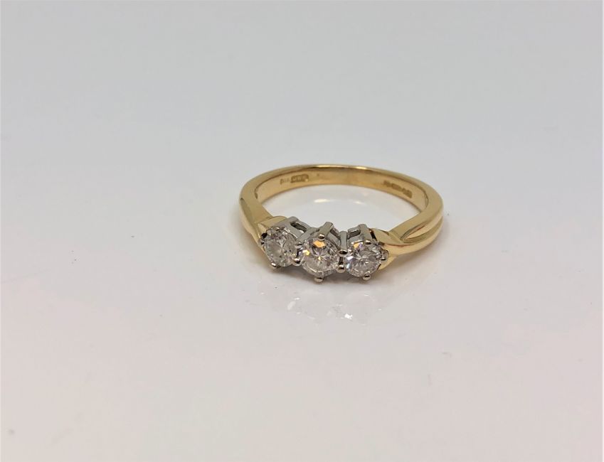 An 18ct gold three stone diamond ring, approximately 0.5 carat total, size L