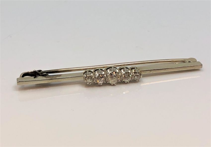 An 18ct gold and platinum five stone diamond brooch, approximately 0.9ct, 5.2g.