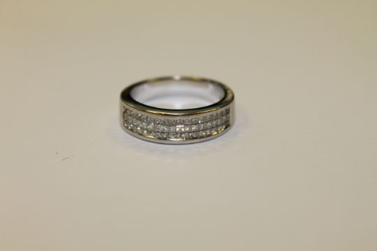 An 18ct white gold ring set with 54 princess cut diamonds CONDITION REPORT: Lot 147 Is a size L.The shank is stamped showing 0.73ct of diamonds , because of the way they are set and size I can't grade them but they are uniformly bright and not drawing colour.