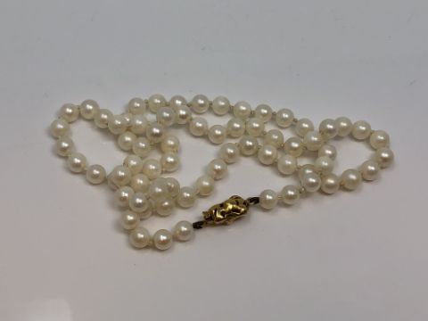 A 20 inch strand of pearls of 18ct gold clasp
