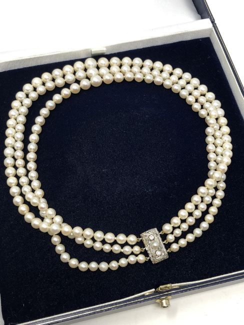 44 cm in length, Continental gold clasp, 14ct gold marks. Pearls 9.4mm to 5.34 mm, Two small round old brilliant cut stones in clasp with further rose cuts. Condition good.
