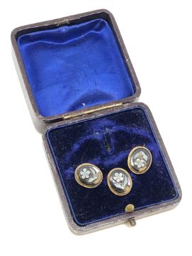 Three 15ct gold agate (flowers) studs, boxed, 4.4g.