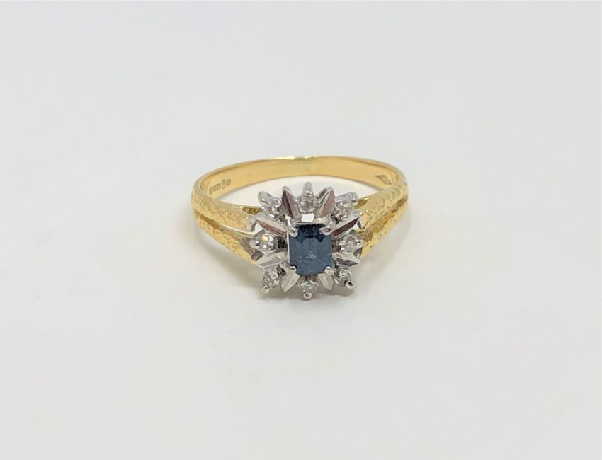 An 18ct gold sapphire and diamond cluster ring, size M