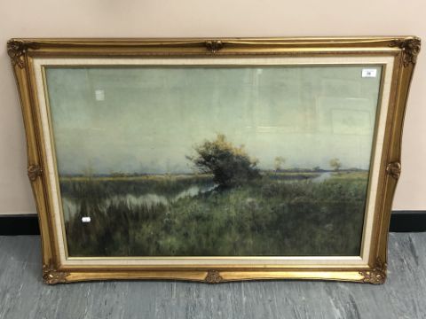 Twentieth Century School : Open Landscape with Cows Grazing by a River, oil on canvas, laid down, indistinctly signed bottom left, 60 cm x 90 cm, framed.