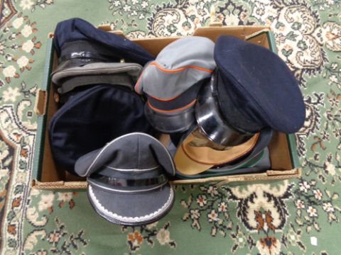 A box of peak caps, military caps etc