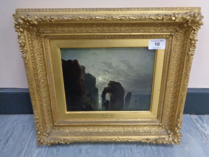 George Balmer (1806-1846) : Marsden Rock, oil on panel, 16 cm x 21 cm, with gallery and framer labels verso, framed.