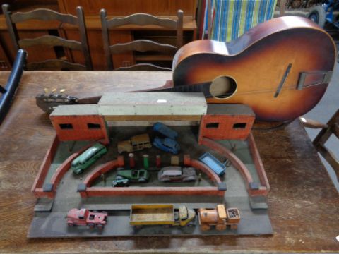 A vintage child's toy filling station, die cast vehicles including Dinky, Super Toys truck etc and an acoustic guitar