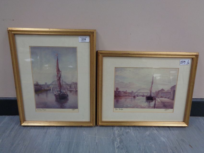 After Walter Holmes : Sailing Barge (With The Tyne Bridge Beyond), reproduction in colours, signed, 25 cm x 17 cm, together with another signed print after the same artist "Tyne Bridge", both parts framed. (2)