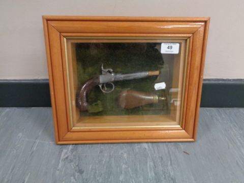 A montage in glazed box frame : Ornamental flintlock pistol with brass and copper powder flask, overall dimensions 28 cm x 33 cm x 7 cm.