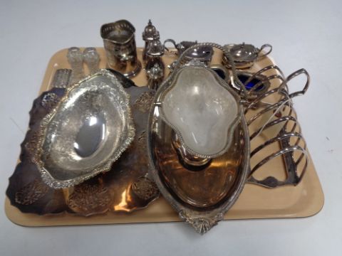 A large silver plated toast rack, together with plated condiment set, bon bon basket etc (Q)