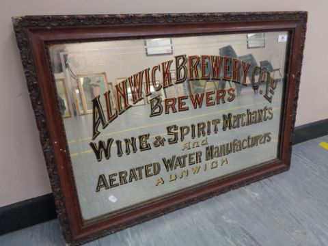 A Twentieth Century Advertising Pub Mirror - "ALNWICK BREWERY CO. LTD. BREWERS WINE & SPIRIT MERCHANTS And AERATED WATER Manufacturers ALNWICK", with a decorative etched surround featuring thistles, 47 cm x 74 cm, framed.