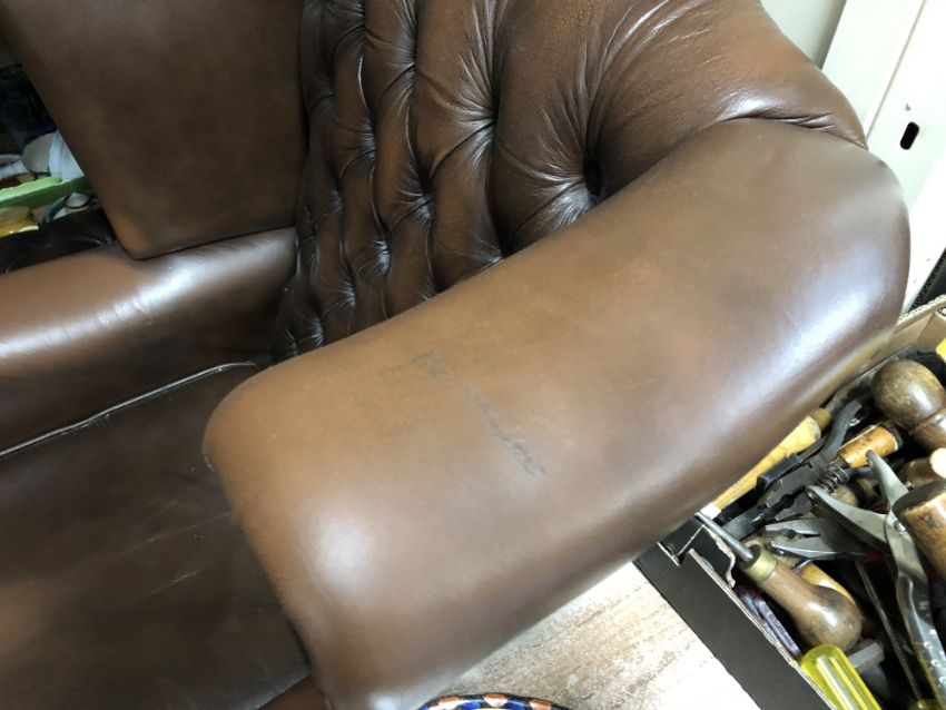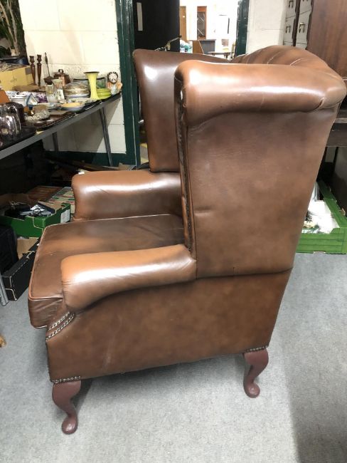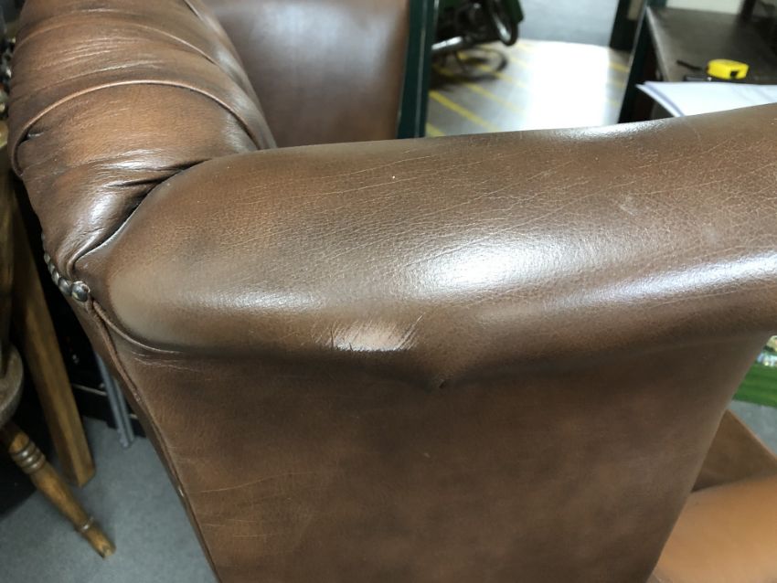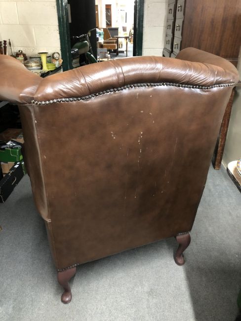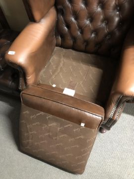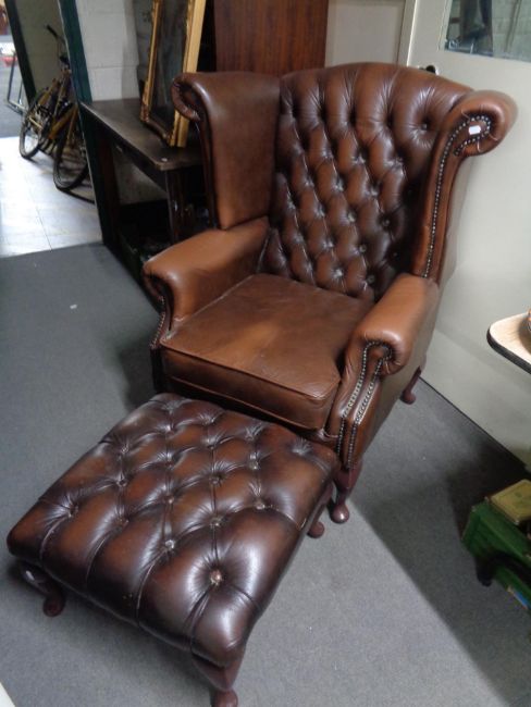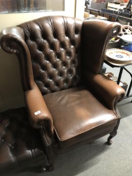 A few marks to the leather but overall both pieces in very good condition. Chair 93cm wide by 106cm high by 85cm deep. Stool 58cm across by 35cm high.