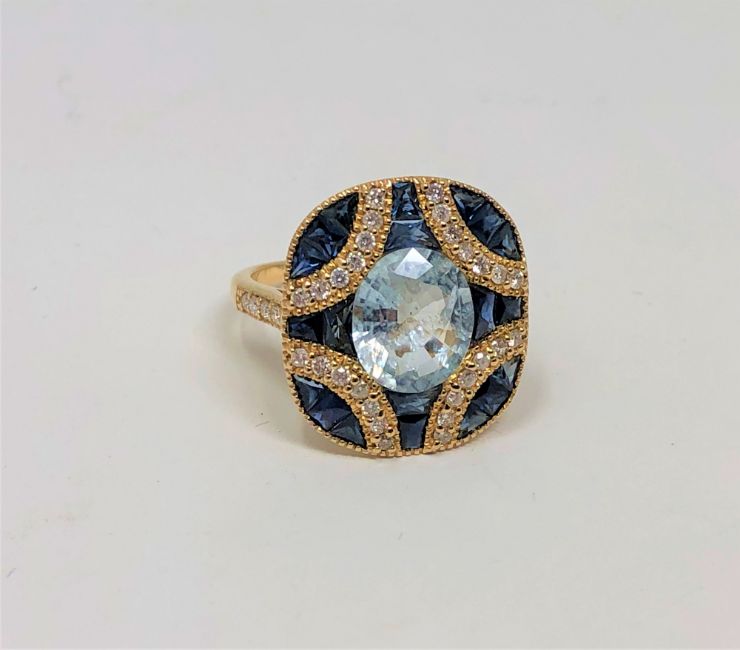 A 14ct gold aquamarine, sapphire and diamond ring, the aquamarine weighing 2.40 carats, the sapphires 2.42 carats and the diamonds 0.31 carat, size K. With certification.