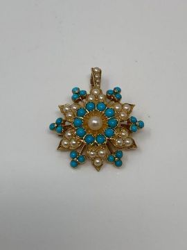 An antique yellow gold seed pearl and turquoise pendant brooch on bar, 7.4g, 24 mm x 24 mm approximately.