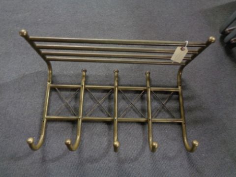 A metal coat rack together with wooden stair rod fittings, antique wooden box containing clips, furniture handles etc