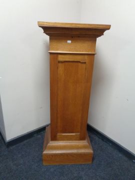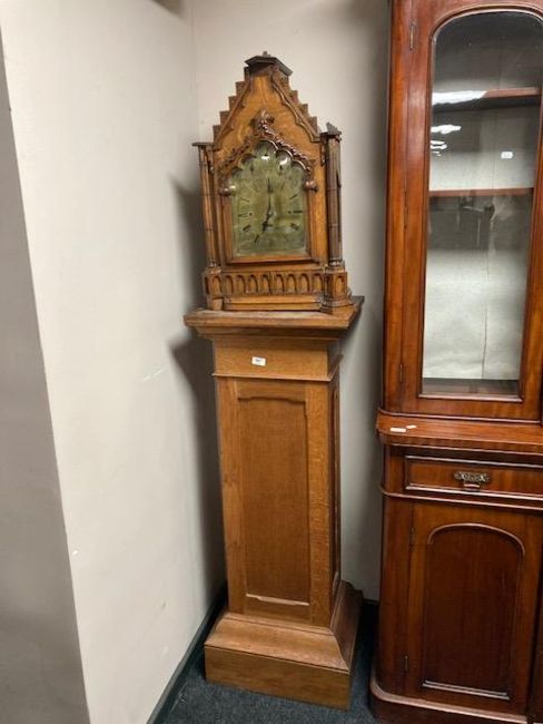 This requires extensive restorations. The case has parts loose, missing, damaged and requires a full restoration. Clock dimensions are height 66 cm, width 42 cm, depth 24 cm. The total width of the brass dial is 22 cm across. The pedestal stands height 121 cm, width 46 cm, depth 38 cm.