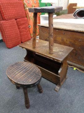 An oak magazine stand together with two stools