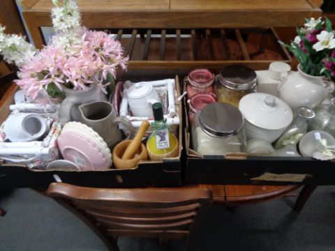 Two crates of un-used kitchen items, ceramics, artificial flowers, storage containers etc