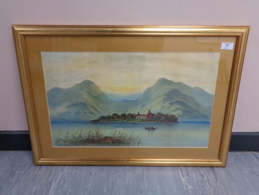 William Baker (1863 - 1937) : Figures Fishing from a Boat on a Highland Loch with Ruins Beyond, watercolour, signed, 34 cm x 57 cm, framed.