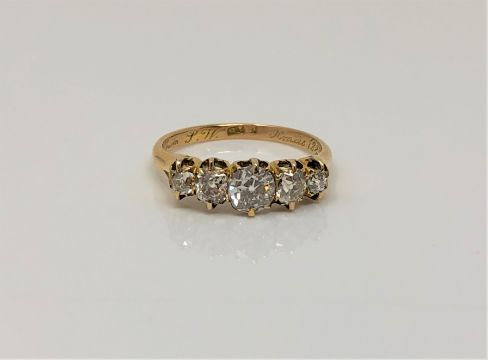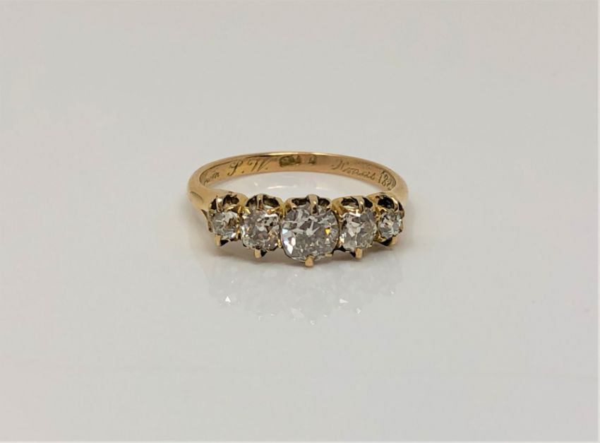 A fine Victorian 18ct gold ring dated 1888 to shank, set with five old cut diamonds, total diamond weight estimated at 1.0 carat, size K