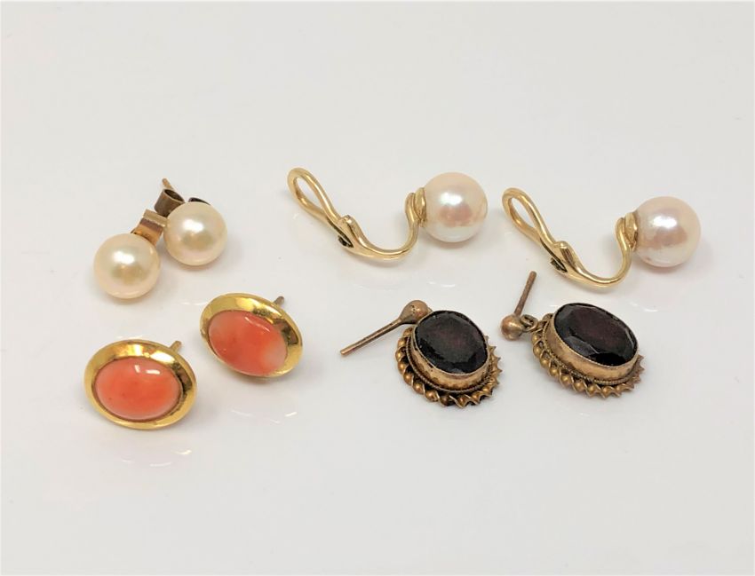Four pairs of gold earrings set with pearls, coral and garnets. (4)