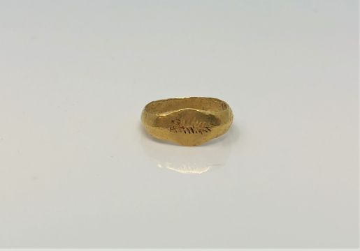A Roman gold child's ring CONDITION REPORT: The ring lot 245 weighs approximately 1g, it is a little misshaped, approximately 12.67mm across at the widest point. The crown is lightly marked with chevron decoration otherwise it is entirely plain and not marked.