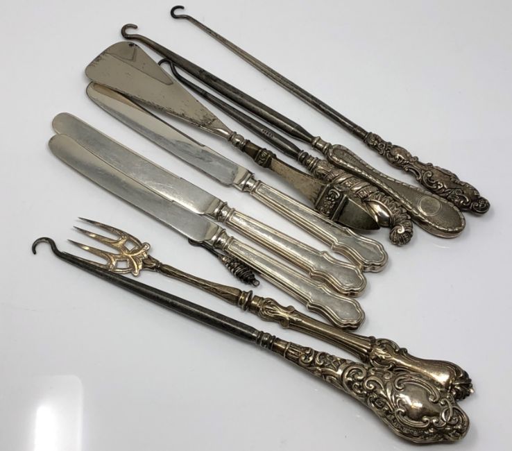 A group of silver mounted button hooks, silver handled knives, shoe horn etc