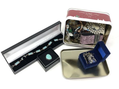 A silver and turquoise panel bracelet, a similar ring and a quantity of costume jewellery. (Qty)