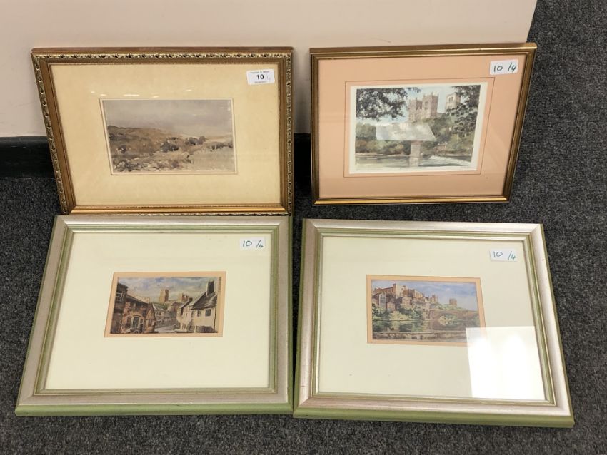 W. G. Armstrong : An Open Hilly Landscape : watercolour, signed, dated 1945, signed, 12 cm x 18 cm, together with a colour print depicting Durham Cathedral and two furthet colour prints also depicting Durham scenes, all parts framed. (4)
