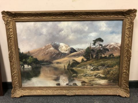 John Trickett (b.1953), Fly fishing in a shallow river with mountains beyond, oil on canvas, signed, 90 cm by 59 cm.