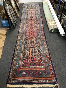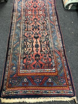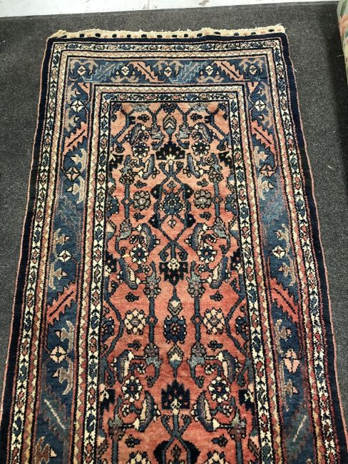 Pile generally good. Selvedges fraying in a few areas but are generally in a stable condition. The fringes have been reduced and one is fraying a little at one end of the runner. One end of the runner is slightly more sun-faded than the other, resulting in somewhat paler colours at one end. Overall good condition.