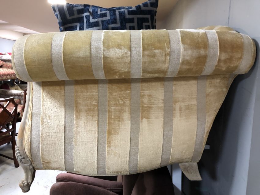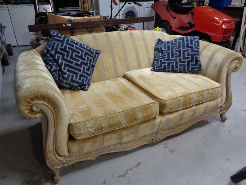A wood framed Duresta two seater settee in gold striped fabric