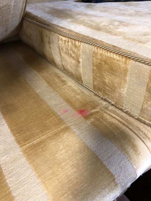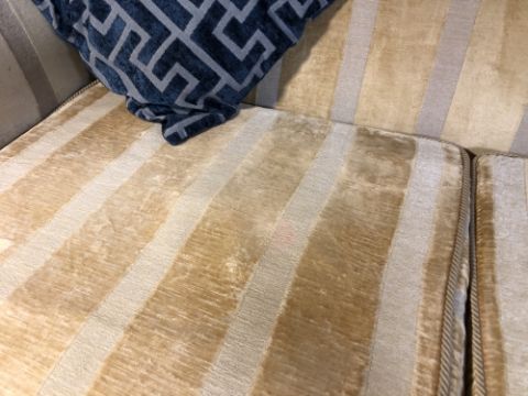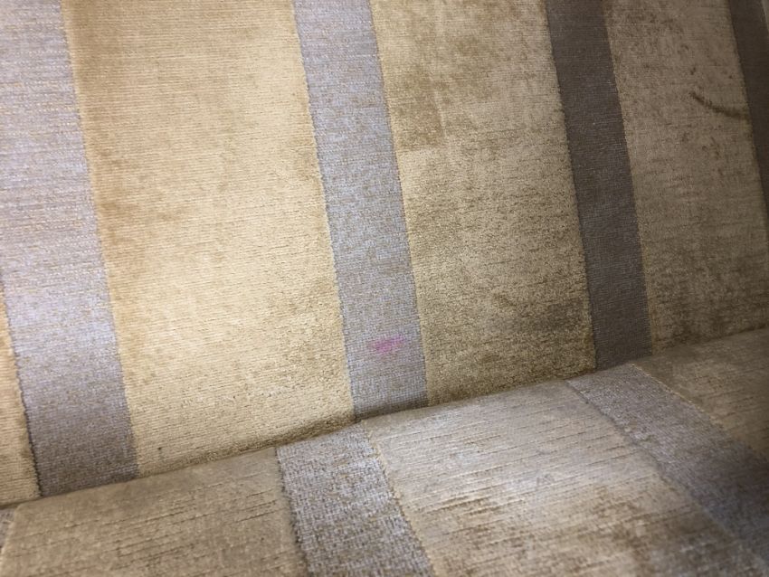 Several areas of pink-coloured staining to the fabric, on the seats and on the lower backrest. Otherwise generally good condition.