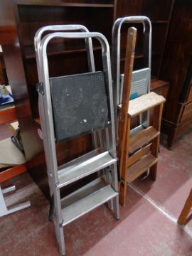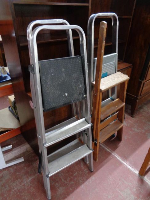 A set of folding pine library steps together with three sets of folding aluminum steps