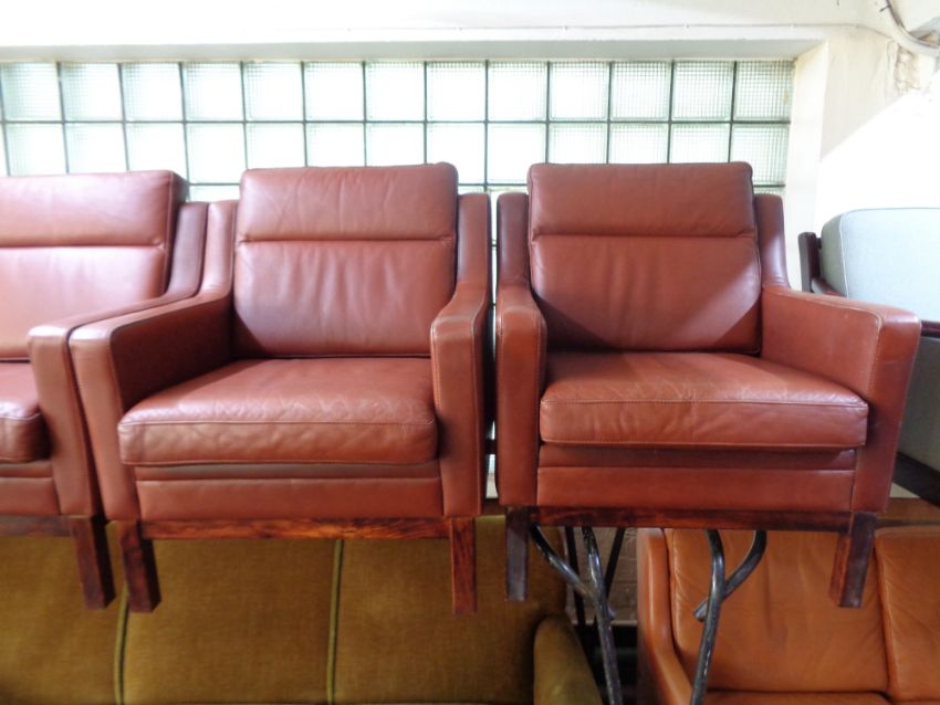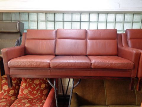 A three piece 20th century Danish lounge suite upholstered in a red leather