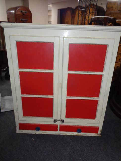 An early 20th century painted pine double door wall cabinet fitted two drawers CONDITION REPORT: The cabinet is 98 cm wide, 112 cm height and 33 cm deep