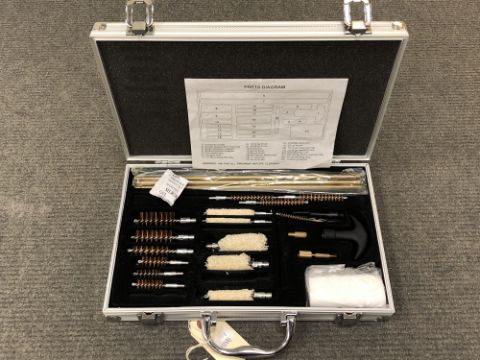 A 23-piece shotgun and rifle cleaning kit, in metal case, new and never used.