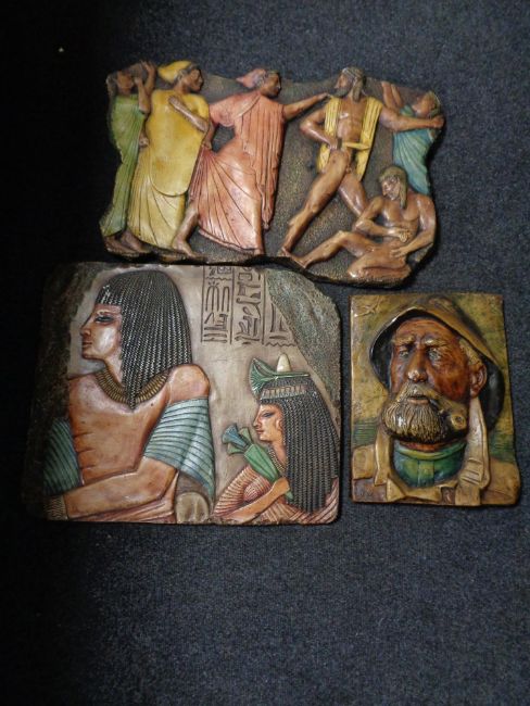 Three 20th century chalk wall panels depicting Egyptian and other scenes