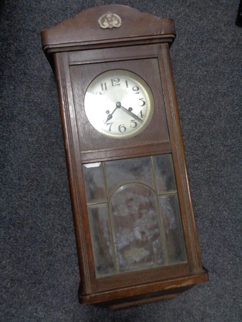 An early 20th century oak cased eight day wall clock with silvered dial, pendulum and key