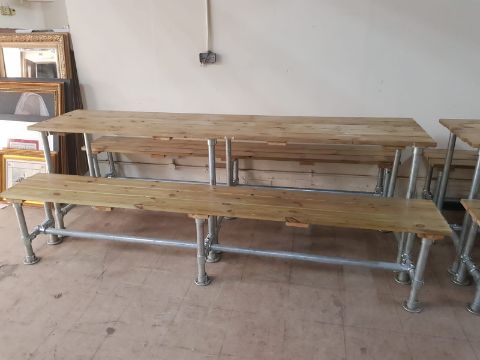 A pine and scaffold table and matching benches, table 260cm long by 60cm wide by 87cm high