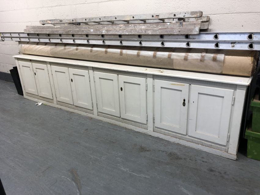 A white painted low sideboard fitted eight cupboard doors, length 381cm, width 50 cm, height 82 cm