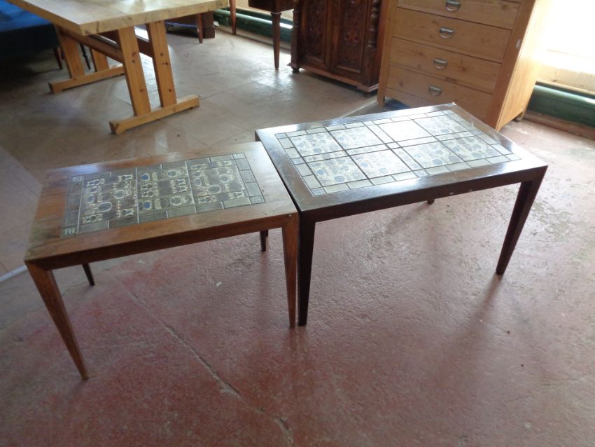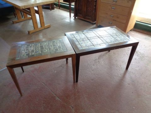 Larger example is 87cm wide by 55cm deep by 50cm high. Other is 70cm wide by 45cm deep by 50cm high. Both fundamentally in good order but with obvious cosmetic wear and tear e.g. watermarks to the tops, scuffs and scratches to the tops and legs. Also there are some splashes/brushes of paint on the wood in some areas.
