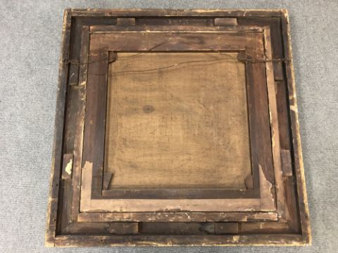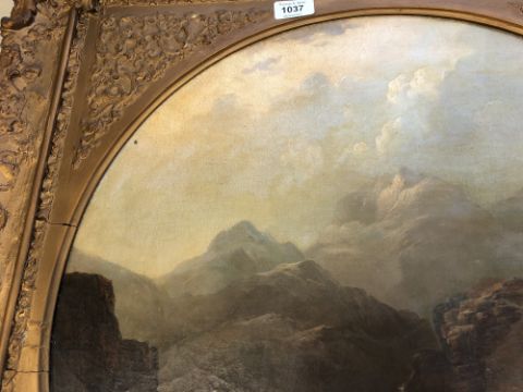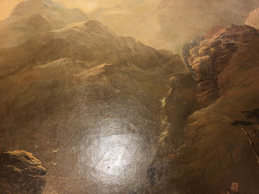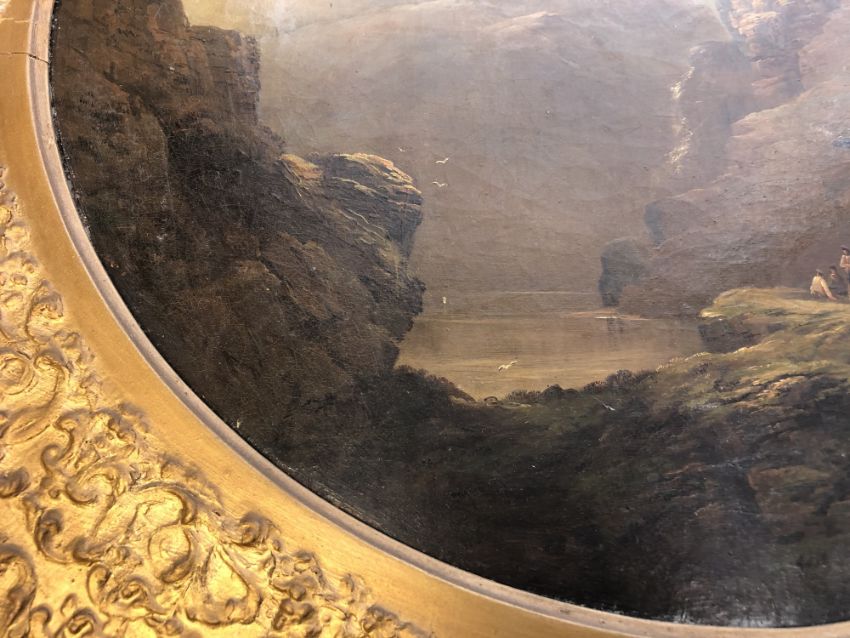 Canvas with all-over yellowish discolouration and staining to varnish. Craquelure all over surface. Small puncture to canvas in upper-left clouds. Slightly larger dent to canvas which has torn slightly, in lower-right, to the right of the rock formation and trees. The mount is circular but the canvas beneath is square. The canvas has not been examined out of the frame. There are small areas of loss to the paint where it comes into contact with the inner edge of the mount. In a 19th century gilt and gesso frame. The frame has clearly been re-gilded at least once. See images.